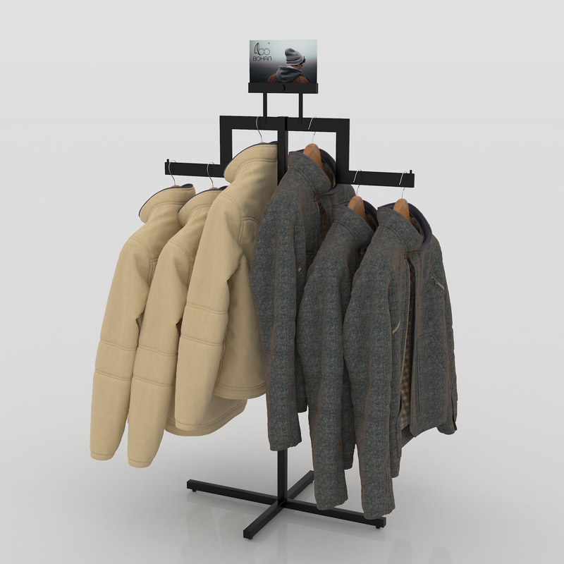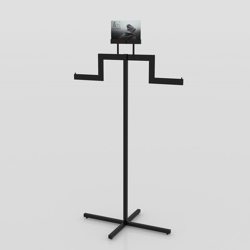 This 2 way clothing rack is made of steel plate and steel tubes. Top sign is made of foamed PVC. Logo or graphic printing could be customized.