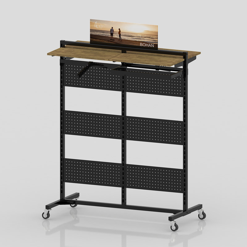 This Island Display rack is in multi-purpose style. The rack could use different fittings (pegs, hangers, shleves) to implement different functions. It could display socks, gloves, caps, clothing such as folded jeans or sweaters and present different merchandise. Logo and printing patterns could be customized.