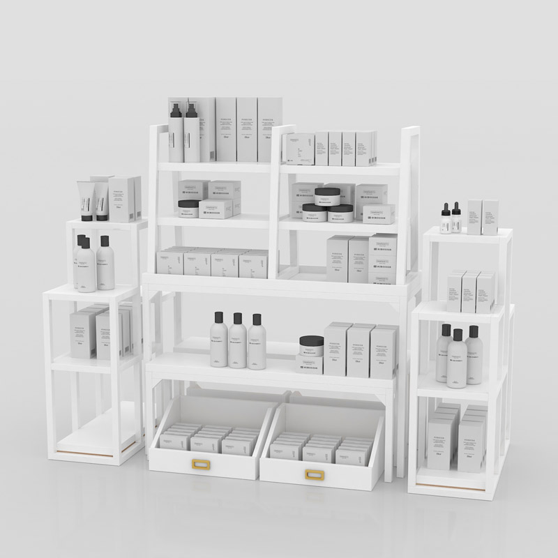 This skincare rack sets is made of square tubes and MDF with wood veneer. MDF with wood veneer or melamine upon request. Idea for beauty, skincare products.